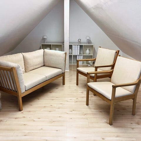 Produceret hos Fritz Hansen og mener det er Ole Gjerløv Knudsen. De kan sættes sammen alle 3 til sofa, men også stå hver for sig. Har et armlæn der kan skrues på, har dog intet billede.
