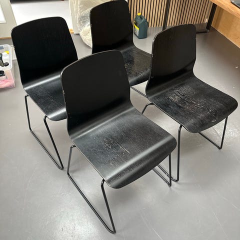 6 stk stabel stole med stål stel og armlæn. Træsort valnød finer. God sidde komfort. Samlet pris