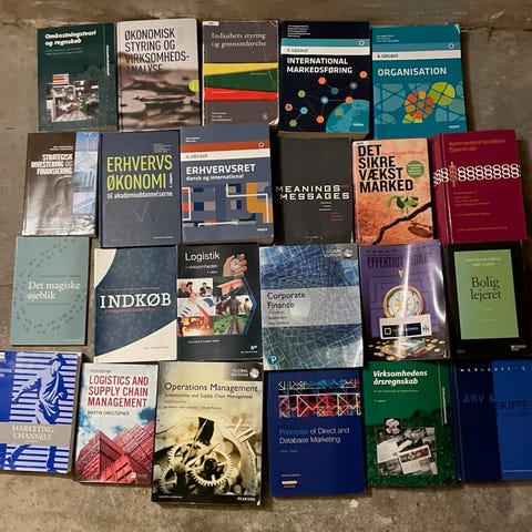 Samling af lærebøger i økonomi og handel. Pakken indeholder forskellige fagbøger om blandt andet driftsøkonomi, økonomisk styring, international markedsføring, ledelse, jura og videnskab i praksis. Velegnet som pensumlitteratur eller supplerende læsning inden for økonomi, handel og erhvervsjura.