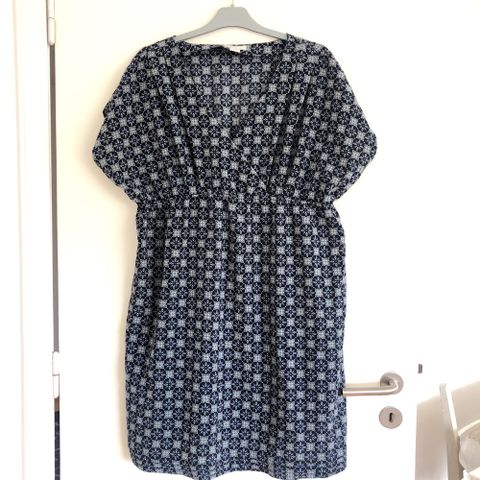 H&M kjole til dame i str. M. Kjolen er sort og fremstillet i viskose. Den har V-udskæring, korte ærmer og bindebånd i taljen. Længden går omtrent til knæet, og pasformen er let A-formet. Ventekjolen kan anvendes med en bluse under til både hverdag og mere pæne anledninger.