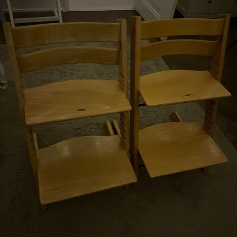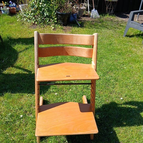 Stokke højstol i træ med naturfarvet finish. Højstolen har justerbar siddeplade og fodplade, som kan tilpasses barnets højde. Egnet som spise- og siddeplads til børn ved bordet. Klassisk stol i solidt træ, der passer ind i de fleste hjemmemiljøer. Gammel model. Uden bøjle.
