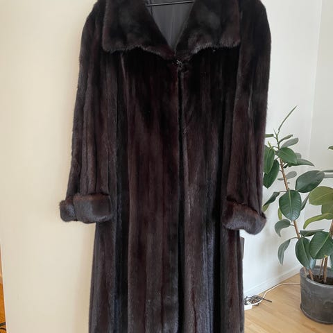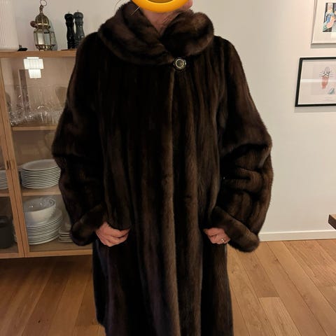 Brun minkpels i fuld længde med dekorativ knap og skjulte sko. To lommer. Ryglængde ca. 118 cm, skulderbredde ca. 49 cm, inderste armlængde 45 cm, bryst ca. 116 cm. Det er en str 40