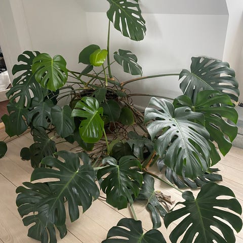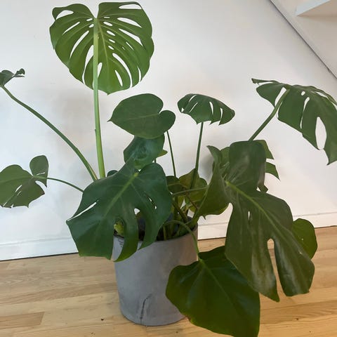 Beskrivelse: Monstera deliciosa stueplante i potte. Planten har store, grønne blade og egner sig som indendørs prydplante i stue eller kontor. Trives typisk bedst i lys uden direkte sol og med jævn vanding, hvor jorden holdes let fugtig. Velegnet som dekorativ plante i hjemmemiljøer.