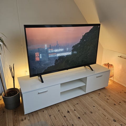 Flot og stilrent væghængt TV-møbel i hvid højglans med trælook top.