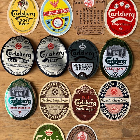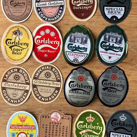 Retro Carlsberg øl og sodavandsetiketter fra 1960érne
