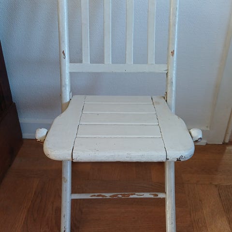 Sammenklappelig børnestol i træ i pastel farver. Stolen har lameller i sædet og enkel ryg med tværgående lister. Den kan foldes helt fladt, så den er nem at opbevare og tage frem efter behov. Velegnet som siddeplads til børn ved bord, leg eller aktiviteter indendørs. Farverne fremstår i lyse pastelnuancer. Kan males. Prisen er for begge 2