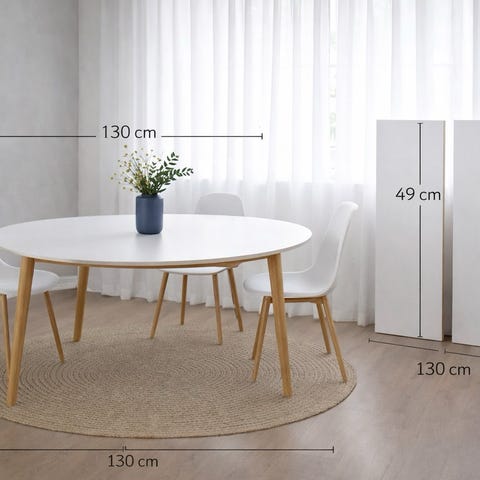 130 cm rundt egetræ/melamin spisebord m 2 tillægsplader