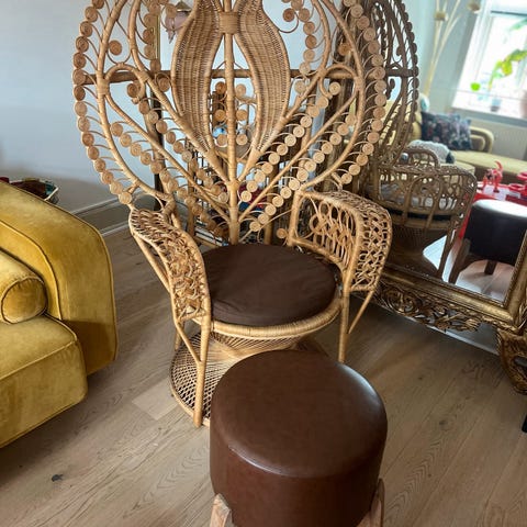 Flot påfuglstol med dekorativ ryg og nyt fransk flet i sædet.
