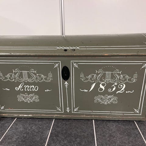 Trækiste i hvidmalet træ med buet låg. Indvendigt fremstår kisten i naturtræ med synlige brædder. Velegnet til opbevaring af f.eks. tekstiler, legetøj eller andre genstande i bolig, gang eller kælder. Kisten har håndtag i siderne, så den er nem at flytte rundt på. Mål 86 cm bred, 47 cm dyb og 48 cm høj