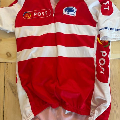 Parentini cykeltrøje i størrelse XS. Kortærmet model i rød og hvid med gule detaljer og Danmark-tryk. Trøjen har gennemgående lynlås foran, elastisk kant nederst og baglommer. Fremstillet i let, åndbart materiale egnet til landevejscykling og træning.