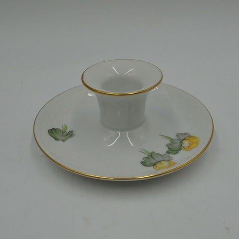 Bing & Grøndahl lysestage i hvidt porcelæn fra stellet "Erantis" (nr. 72), dekoreret med gule blomster og guldkant
