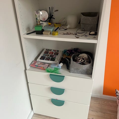 IKEA reol med åbne hylder og skuffer. Møblet er i hvidt materiale med tre skuffer i lys træfarve nederst og åbne hylder øverst. Hylderne er justerbare i højden via huller i siderne. Egnet som opbevaringsmøbel på børneværelse eller i andre rum til tøj, legetøj eller bøger