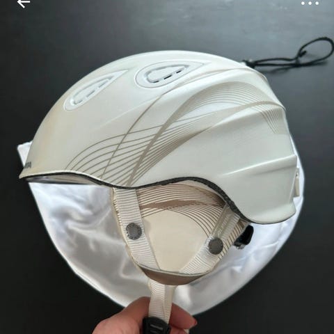 Skihjelm, Hvid. Købt for 900. Den har fået en del ridser trods forholdvis få gange i brug. Men den fejler ikke noget. Slet ikke slidt på indersiden
