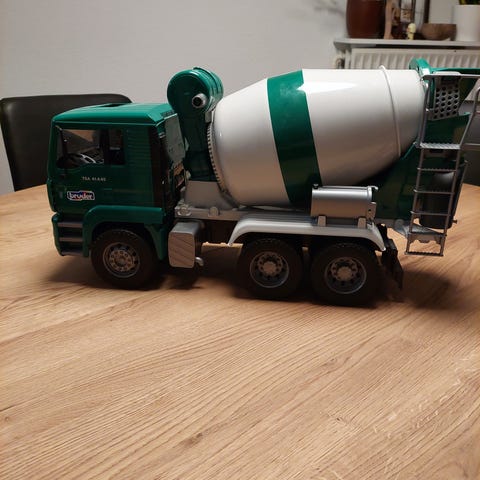 Bruder legetøjs lastbil betonmixer i rød plast. Lastbilen er udformet som en betonblander med roterbar tromle og påmonteret sliske bagpå. Kabinen har detaljerede elementer som spejle og frontgitter. Skal hentes