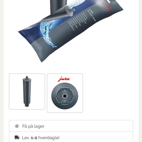 Jura vandfilter til kaffemaskine. Vandfilteret er beregnet til brug i Jura espressomaskiner/kaffemaskiner for filtrering af vand i maskinen. Leveres i plastemballage som på billedet. Størrelse, modelbetegnelse og øvrige specifikationer er ikke angivet.