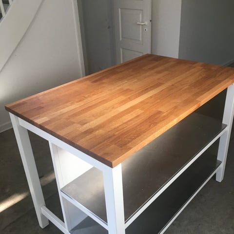 Køkkenøen står på hjul, hvilket gør den flytbar og anvendelig både som ekstra arbejdsplads og som opbevaringsmøbel i køkken eller alrum.