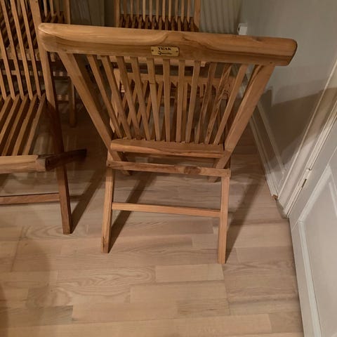 Teak spisebord og 6 spisestole. Stolene trænger til en kærlig hånd