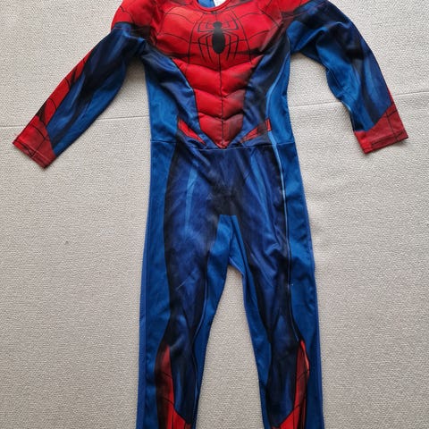 H&M Spiderman kostume til dreng i str. 122/128. Dragten er i multifarvede røde og blå nuancer og er fremstillet i polyester. Kostumet består af en heldragt med trykt spindelvævsmønster og polstrede muskelpartier på overkroppen samt tilhørende hætte/maske i samme design. Velegnet som udklædning til fastelavn, temafester eller leg derhjemme.