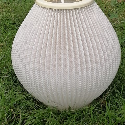 Flot klassisk lampe med hvid håndfoldet skærm og guld midte. Passede desværre ikke ind i vores hjem da vi allerede har en af de lamper hængt op..