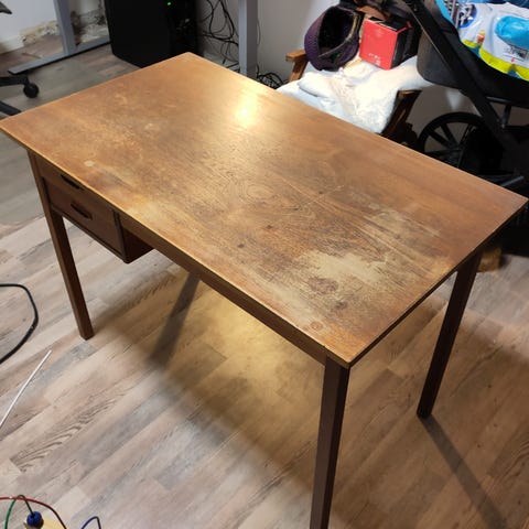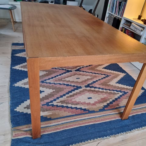 Skrivebord, arbejdsbord, spisebord. Måske lys teak. Godt brugt og afbleget af solen, men virkelig gid kvalitet.