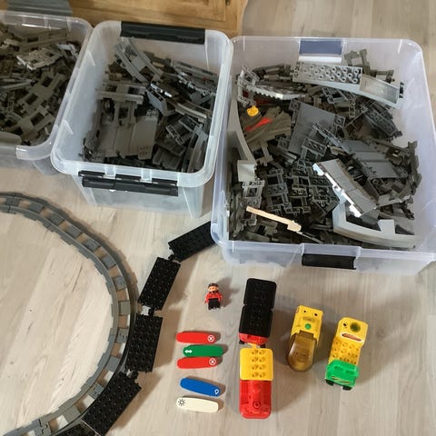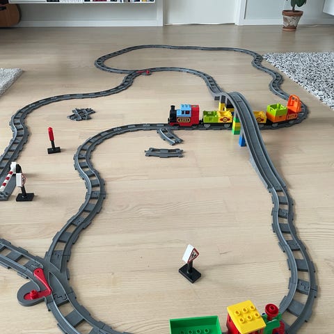 LEGO DUPLO togbane med skinner og flere tog og vogne. Sættet består af buede og lige skinner, sporskifter, broer og ramper samt forskellige toge og togvogne.