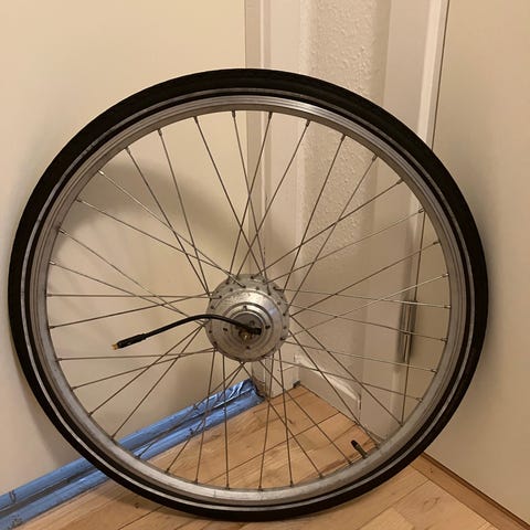 El-cykel forhjul med motor 36.V, 28 tommer med dæk og slang virker godt, ingen fejl eller skæve.