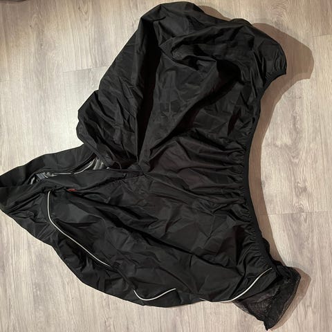 Sættet består af et sort regnslag med reflekser og gennemsigtig plastfront samt et sort net, der fungerer som insekt- eller myggenet.