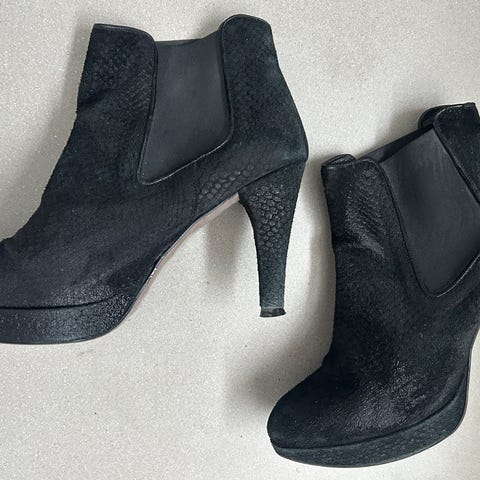 Mentor højhælede sko i form af ankelstøvletter i størrelse 40. Skoene er sorte med struktur i overfladen og elastikpaneler i siderne. De har høj hæl og let plateau foran, som ses på billederne med mål. Ydersålerne er glatte med synlig brug. Velegnet som højhælede støvletter til hverdag eller fest.