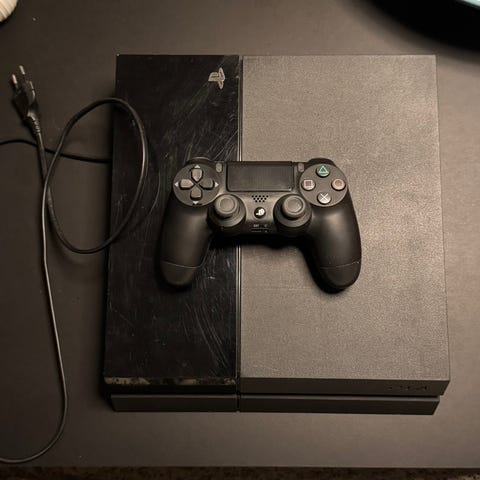 Ps4 + controller og kabler dog uden opladerstik til controller. Nulstillet med synlige brugsspor