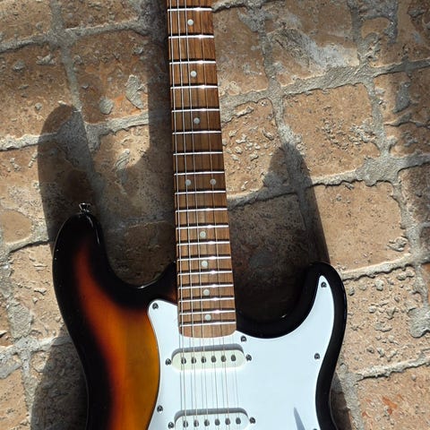 Starsound elektrisk guitar i stratocaster-stil med klassisk dobbeltcutaway-krop. Guitaren har sunburst-finish på forsiden og sort bagside samt hvid slagplade. Udstyret med tre single-coil pickupper, 5-vejs pickupvælger, volumen- og tonekontroller samt tremolo-bro. Hals i lyst træ med mørk gribebræt og dot-inlays. Velegnet som elektrisk guitar til øvning, undervisning og generel brug i forskellige musikgenrer.