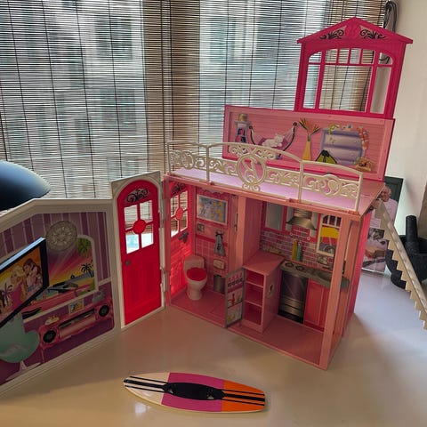 Barbie dukkehus i form af en kuffert i lyserød plast. Når kufferten åbnes, bliver den til et lille dukkehus med seng med baldakin, natbord og indbygget badekar