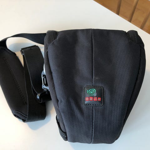 Kata DC-443 DL kamerataske. Tasken er polstret og indvendigt foret med velcro til de justerbare rumdelere til lettere organisering. Tasken har udvendige lommer på hver side, samt netlomme under låget til småting. Udvendigt har den bærehank og remfæste, så den kan bæres i hånden eller over skulderen. Har tidligere været brugt til et Nikon D7000 med batterigreb og to objektiver samt speedlight, hvor der stadig var plads i overskud.