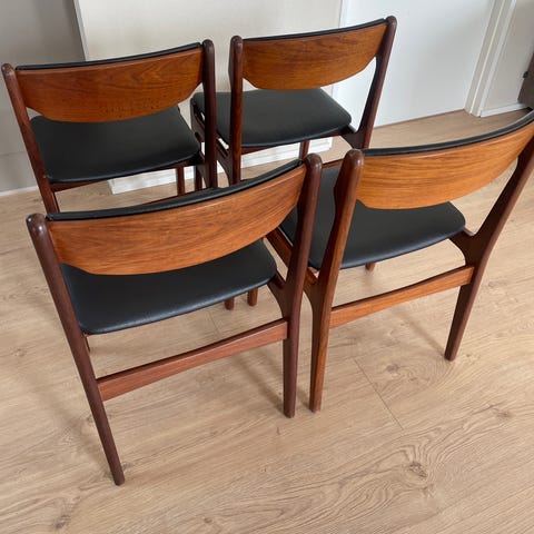Jeg sælger mine gode spisebordsstole i teaktræ med puder af sort læder. Pris er for alle fire stole. Standen er rigtig god.