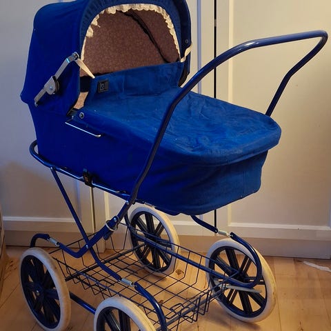 Dukkevogn fra 90'erne, kørt mange turer. Den har stået i en kælder i ca 30 år, så den skal lige igang igen, måske smøres. Den er renset og pude og dynebetræk er vasket. Dynen og puden medfølger.