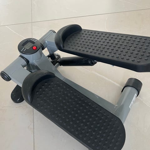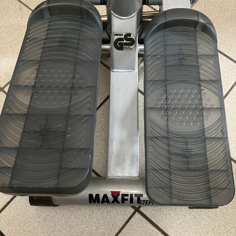 Maxfit stepmaskine med to skridtplader og integreret display til visning af træningsdata. Kompakt model egnet til hjemmetræning af ben og kondition. Maskinen har skridsikre pedaler og mekanisk modstand, der aktiveres ved trinbevægelser. Velegnet til brug på gulv i f.eks. stue eller træningsrum.