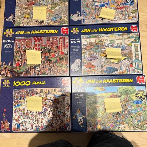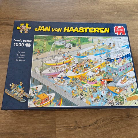 Jan van Haasteren puslespil med motiv af travl gadescene. Puslespillet består af 1000 brikker og viser en detaljeret og humoristisk tegning med biler, mennesker og bygninger. Velegnet til puslespilsentusiaster, der kan lide farverige og komplekse motiver.
