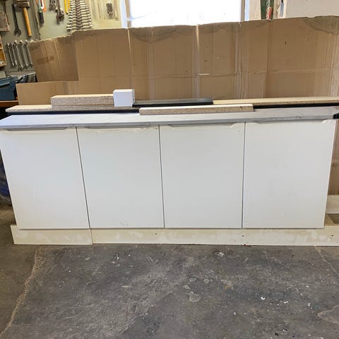 3 stk 50 cm hyldeskabe 1 stk 50 cm skab med 2 indvendige skuffer HTH bordplade sort sokkel tilpasning og monteringspose. Står løst og kan monteres som man vil.