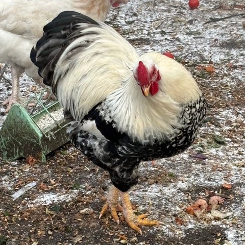Stor Wyandotte. Hanen er Sort/sølv og hønerne er enten sort/sølv eller blå/sølv (Forskel ses tydeligt på billederne).