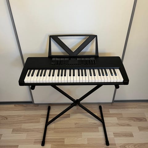 Keyboard med indbygget højttaler og tilhørende mikrofon. Keyboardet har flere funktionsknapper til lydvalg, rytmer og demo-sange samt digitalt display i midten. Sort kabinet med hvide og sorte tangenter. Egnet til musikleg, fx til børn eller begyndere, der vil eksperimentere med forskellige lyde og simple melodier.