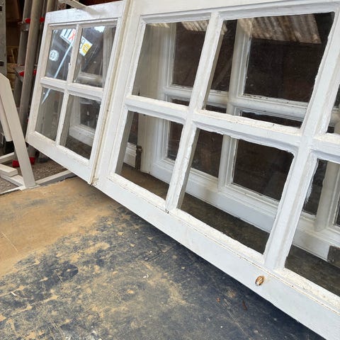 Smuk patineret terrassedør i sundt kernetræ og med karm. Originale Hamborg hængsler. Fra gammelt lysthus i Sverige midt 1800-tallet.