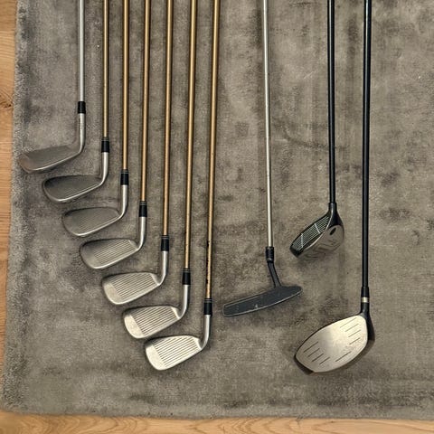 Sættet omfatter flere jernkøller samt enkelte andre køller, som ses på billederne. Køllerne er fra Callaway-serien Big Bertha, og der medfølger en Callaway golfbag med flere lommer og bærehåndtag.