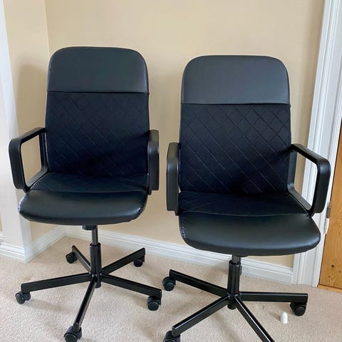IKEA kontorstol i sort stof og kunstlæder. Stolen har polstret sæde og ryg samt buede armlæn. Egnet som kontor- eller arbejdsstol i hjemmekontor eller lignende. Standard kontorstolsdesign med høj ryg for støtte ved længere tids brug.