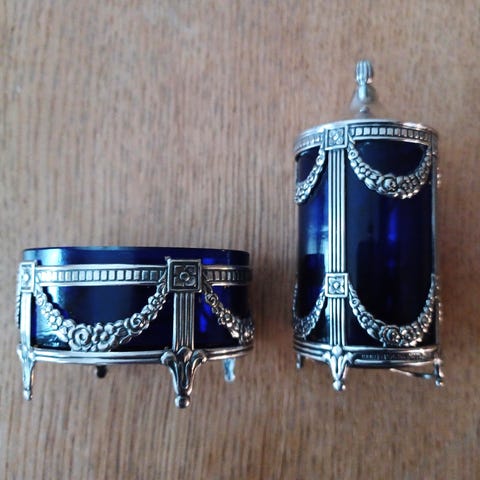 Sølv holder med blå glas bund - Den ene bund er mindre en den anden - ligger lavere i indsatsen - Den store glasbund har et lille afslag -Se foto