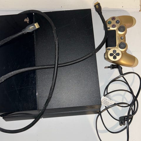 Sony PlayStation 4 konsol i sort med tilhørende DualShock 4 controller. Konsollen er egnet til spil, streaming og virker som den skal. Strømkabel og HDMI-kabel kan tilsluttes til tv eller skærm for brug af konsollen. Controlleren forbindes trådløst eller med kabel til konsollen.