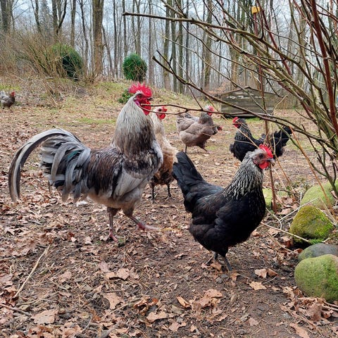 Racerene rugeæg fra ubeslægtet hane og høner. Det er muligt at se forældredyrene, som går under gode forhold.