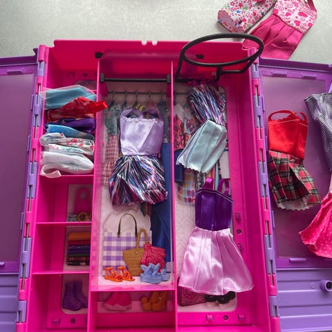 Barbie garderobesæt med dukketøj og tilbehør. Sættet indeholder et klædeskab med bøjlestang og hylder samt flere forskellige kjoler, outfits og sko i forskellige farver. Der medfølger også mindre tilbehør som tasker og andre småting til Barbie-dukker. Velegnet som udvidelse af Barbies garderobe og til leg med påklædning og rollelege.