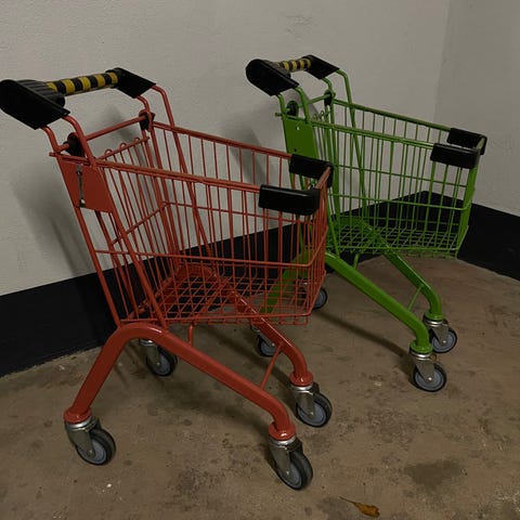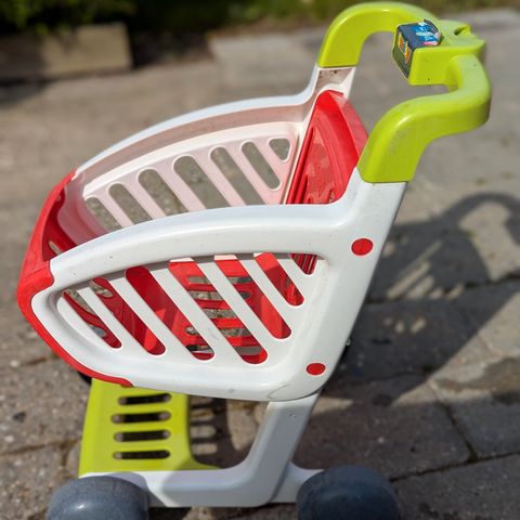 legetøjsindkøbsvogn i plast i grå og gul. Den er i virkelig god stand og har ingen ridser. Det forreste styk ved det gule er der plads til der kan sidde en baby dukke. Kan hentes fysisk eller sendes.
