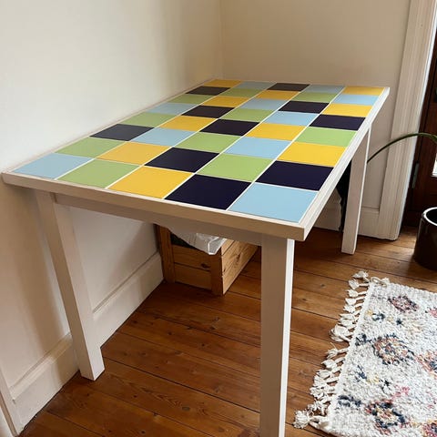 Flot spisebord med grå klinker og træramme. Måler 76 x 148
