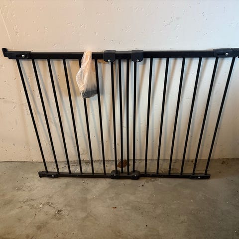 Sikkerhedsgitter i sort metal. Gitteret er egnet til afskærmning af åbninger, fx døre eller trapper, for at forhindre små børn eller kæledyr i at passere. Klassisk gitterkonstruktion med lodrette tremmer og beslag i siderne til montering på væg eller karm. Velegnet til indendørs brug.