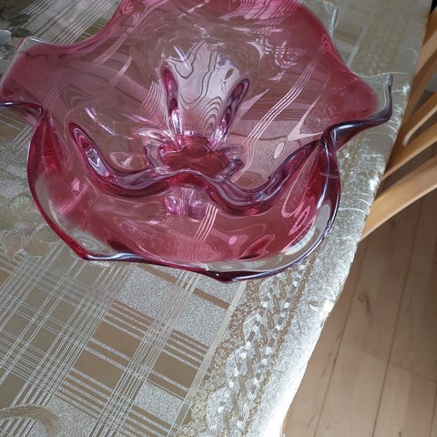 Smuk håndlavet kunstglasskål udført i kraftigt mundblæst glas med indlagte luftbobler og slebet fod ,begrænset oplag.